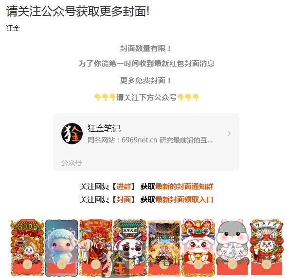 临近春节,很多品牌方都会在微信公众号等渠道,发放免费的红包封面给用户,以提升品牌影响力。而封面领取地址可以被分享,我们同样可以利用他们的免费封面,为我们获取流量。