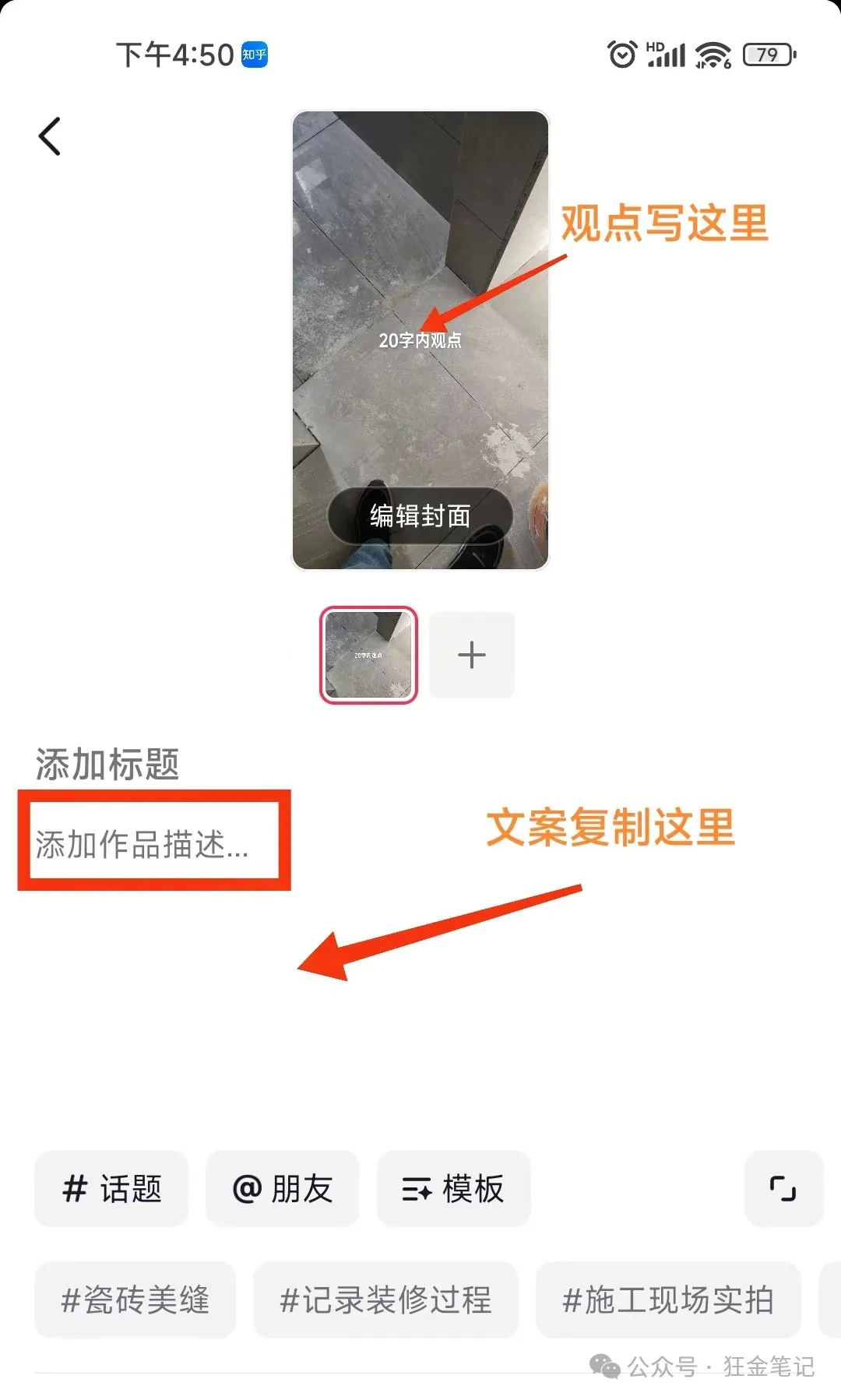 点下一步,在视频描述中,加上装修关键词,然后将之前提取的热门视频完整文案,一字不差复制上去。